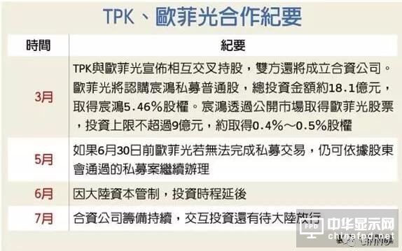 3月間觸控面板廠TPK-KY宸鴻和陸廠歐菲光宣布交叉持股,同時還表示將成立合資公司,共同接單、發展新技術。不過,到目前為止資金還遲遲未到位,因為受到大陸嚴格管制資金匯出的影響,這樣可能會成為為雙方的合作增添變量因素。