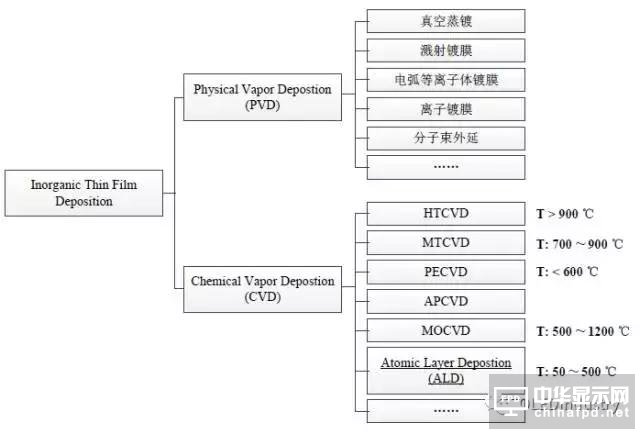 在FDP 的生產中, 在制作無機薄膜時可以采用的方法有兩種:PVD 和CVD (本文跟從眾多資料的分類法, 將VE 和VS 歸于PVD 而ALD 歸于CVD)。