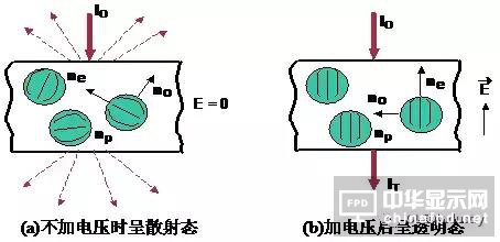 在外加電場驅動下,液晶分子和二色性染料分子的排列取向與電場方向一致,從而表現出明(彩色)/暗對比的顯示效果