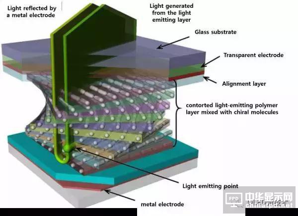 Kim Jae hoon教授解釋:“高分子OLED發(fā)光材料產(chǎn)生的一般都是高線性的線偏振光。當(dāng)這種光穿過含有手性分子的發(fā)光層時(shí),它可以變成了圓偏振光,理論上,相應(yīng)角度的圓偏振光可以毫無損失的通過OLED偏光片,光效率提高100%,這樣就可以實(shí)現(xiàn)更低功耗,更亮的OLED屏幕。