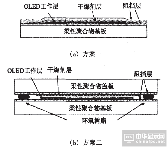 這對柔性OLED來說是不可能的。但是我們可以考慮在器件內部把干燥劑制成柔性的薄膜。(a)和(b)分別表示了如何在單片和層疊的柔性OLED器件內制作干燥劑薄膜的兩個方案。