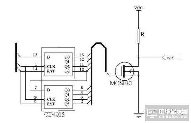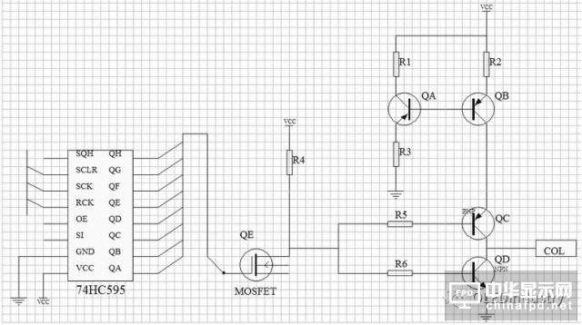 行驅(qū)動(dòng)電路接收這些信號(hào),當(dāng)移位寄存器輸出的為高電平時(shí),該行的MOSFET管導(dǎo)通,選擇適當(dāng)?shù)碾娮鑂,使得三級(jí)管輸出到行電極的為低電平,該行就被導(dǎo)通。