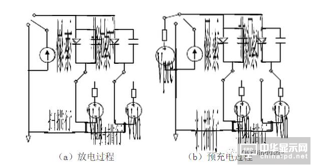 1、當(dāng)行掃描開始后,先采用(a)所示電路CD放電,行列驅(qū)動(dòng)電路均接地,使電容兩端電壓為零。