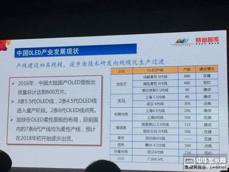 耿怡介紹說,2016年,中國大陸國產OLED面板出貨量總計達到600萬片。目前,有3條5.5代OLED線、2條4.5代OLED線進入量產階段,2條6代OLED線點亮。柔性OLED面板也在加緊布局,國內7條6代柔性OLED產線,預計在2018年初開始逐步出貨。