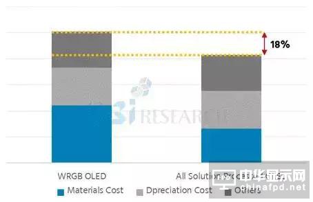 在UBI Research舉辦的OLED溶液制程年度論壇上,嘉賓們針對打印OLED技術進行了詳細的討論,對于打印OLED成本的判斷,此次會議給出了較為準確的結論:對比WOLED,打印OLED的材料成本節省最多40%,制造成本節省約18%。