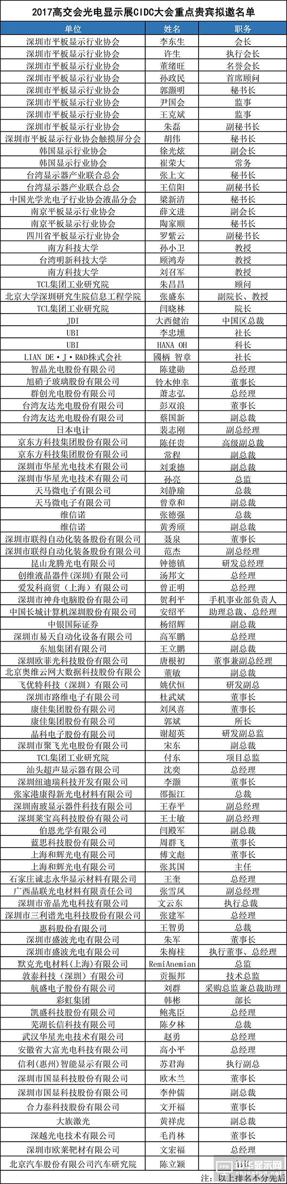 第十三屆中國國際顯示大會(CIDC2017)以“創(chuàng)新與超越”為主題,涵蓋顯示峰會、“聯(lián)得裝備”圓桌高峰論壇及人工智能即將來襲·全面屏的變數(shù)-2017手機黑科技技術(shù)及投資峰會。大會將邀請三星、LG、JDI、維信諾、華星光電、友達、京東方、天馬微電子、和輝光電、信利等面板廠商,康寧、默克、凸版印刷、聯(lián)得裝備、東電、日東、上海微電子、康耐視、TOPCON、東麗華科技、紐迪瑞科技等材料和裝備廠商,創(chuàng)維、康佳、TCL、海信、樂視、華為、小米等電視和手機廠商,航盛電子、天派電子等車載顯示廠商,以及國際信息顯示學(xué)會(SID)、日本畫質(zhì)學(xué)會(SPQE)、韓國顯示行業(yè)協(xié)會(KDIA)、臺灣顯示器產(chǎn)業(yè)聯(lián)合總會(TDUA)、中國光學(xué)光電子行業(yè)協(xié)會液晶分會(CODA)等國內(nèi)外行業(yè)協(xié)會代表性的企業(yè)家、技術(shù)專家、學(xué)者、教授、工程師以及金融界、投資界、新聞媒體界的精英人士300余人共同參會。