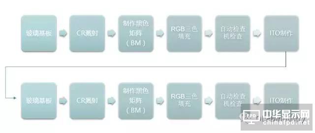 Color Filter(彩色濾光片)是組成面板中最重要的關鍵零組件,占面板制造總成本約四分之一,制造生產方式是在素玻璃基板上用紅、綠、藍色的光阻液原料,用黃光蝕刻方式或是其它技術(如顏料分散或轉印方法)形成與紅、綠、藍三原色的長條形數組的基板。