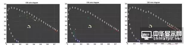 其他器件參數固定,調整光學調整(共通)層,對RGB色標影響如下。腔長越長,光色越向長波長方向偏移。其中光色對腔長的敏感度,是按GBR排序,G CIE的變化軌跡,在CIE1931色品圖拐角處,其變動幅度遠大于B&R。
