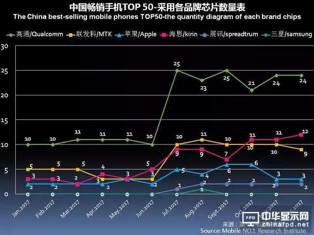 12月中國暢銷手機TOP 50中,采用高通芯片的有24款,聯發科(MTK) 9款,海思12款,蘋果3款和展訊2款。高通芯片占有率達48%的份額。