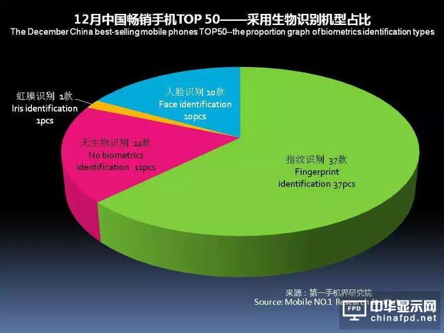 12月中國暢銷手機TOP 50,采用指紋識別功能的手機有37款,占比74%;采用虹膜識別有1款,占比2%;采用人臉識別有10款,占比20%,沒有采用生物識別功能的手機有11款,占比為22%。