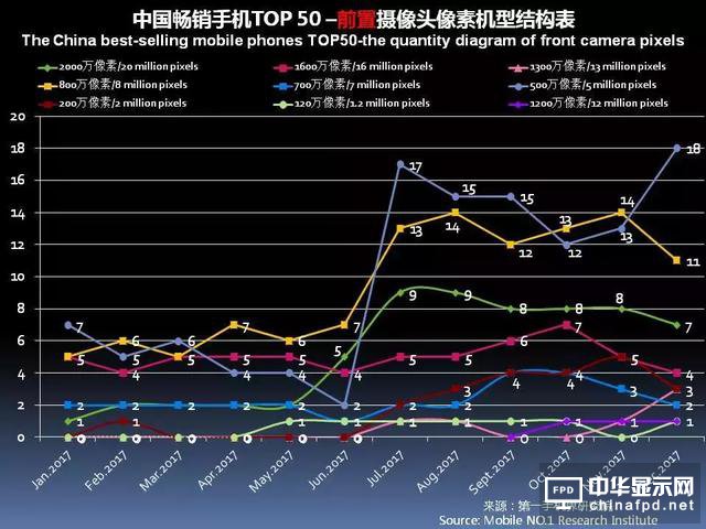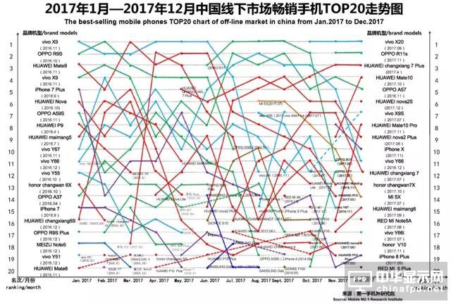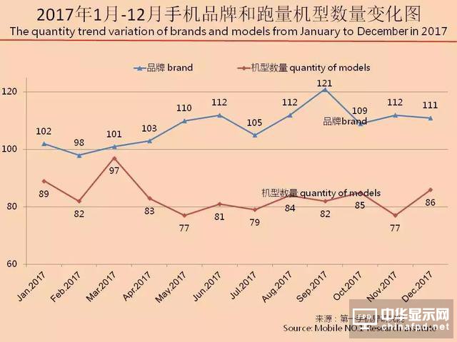 根據七星手機連鎖、話機世界、廣西王者通訊、四川龍翔通訊、廣東麗的通訊、廣東新星源手機數碼連鎖、黑龍江省凌志手機連鎖、海南王者天創、山西太通科技、山西遠大通訊、湖南齊欣通訊、江西麗華通訊、湖北九鼎通訊、吉林天天手機、云南九機網、甘肅悅達、陜西中人、河南兄弟通訊商會、河南國宇、河南勝天、江蘇國網、河北潤德、廈門中橋、迪信通、貴州誠訊、華偉通訊、大地通訊、重慶祥佳音、河北國通等全國手機連鎖賣場銷售數據統計結果顯示,2017年12月在中國線下渠道銷售的手機品牌達到111個,環比11月112個,減少了1個;12月有一定銷量的手機機型達到86款,環比11月77款,增加了9款。