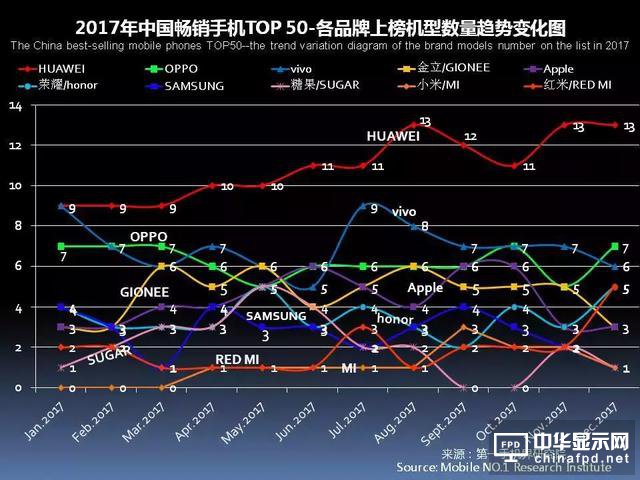 2017年12月在中國大陸線下渠道走量的手機機型基本分布是,華為 17款、金立11款、vivo11款、榮耀9款、OPPO 8款、蘋果6款、紅米5款、SUGAR糖果手機3款、朵唯3款、三星、小米2款和中國移動各2款、中興、紅辣椒、卡布奇諾、青橙、華岷、百合、豐迅達各1款。