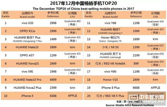 vivo X20、OPPO R11s、華為 暢享7 Plus、華為 Mate10、OPPO A57、華為 nova2S、vivo X9S、華為 Mate10 Pro、華為 nova2 Plus、iPhone X成為12月中國暢銷手機TOP 10。