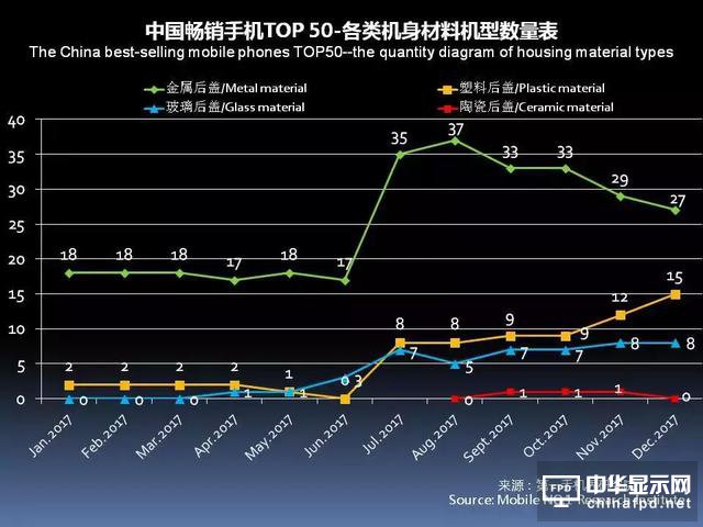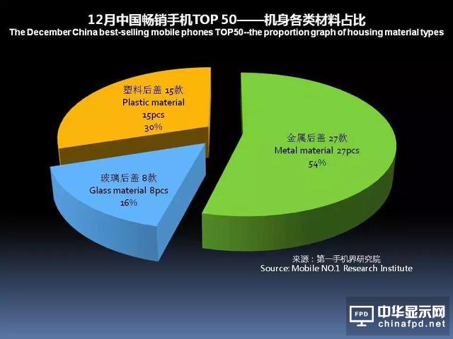 12月中國暢銷手機TOP 50,采用金屬后蓋有27款,占比54%;玻璃后蓋的有8款,塑料后蓋有15款,陶瓷后蓋0款。