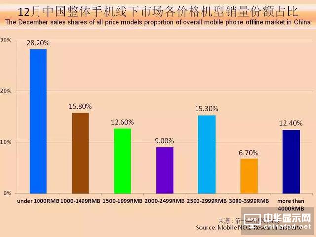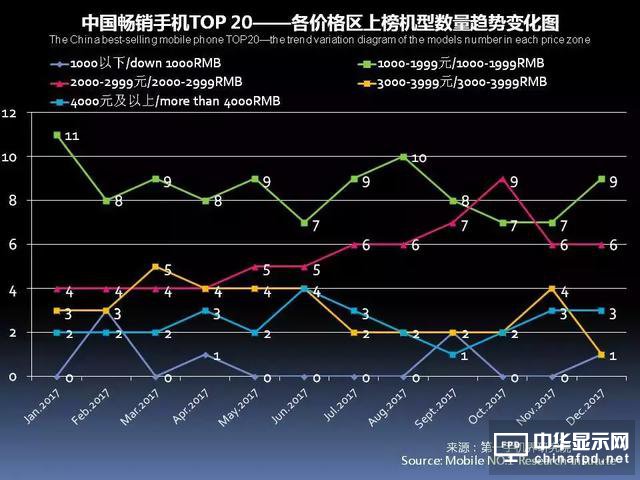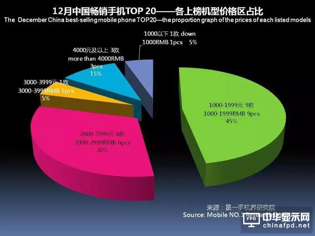 12月中國暢銷手機TOP 20,超過2000元售價的機型占10款;1500-1999元價格段機型占2款;1000元-1499元價格段機型占7款;1000元以下的機型占1款。