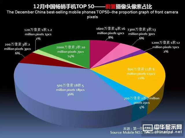 12月中國暢銷手機TOP 50中,前置攝像頭采用2000萬像素的有7款,占比14%;采用1600萬像素有4款,占比8%。
