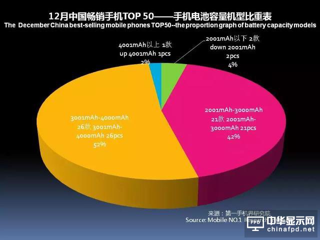 續航能力已經成為手機賣點之一,12月中國暢銷手機TOP 50中,電池容量3001mAh-4000mAh的機型數量已達到26款。(來源:第一手機界)