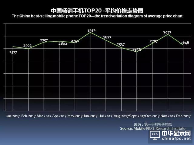 20款暢銷手機平均價格在2648元,環比11月3077元,下滑了13.9%,其中主要原因是由紅米進入了TOP20榜單。