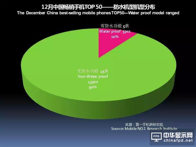 2017年12月暢銷手機TOP 50中,具有防水功能的機型有5款,分別是華為 Mate10 、華為 Mate10 Pro 、iPhone X、iPhone 8 Plus 、三星 Galaxy S8+。