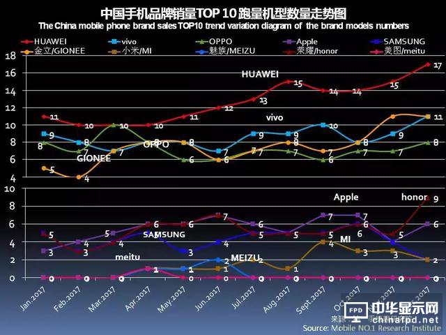 從中國手機品牌銷量TOP10跑量機型數量走勢圖可以看出,華為還在持續增加低端手機機型。