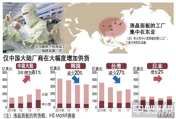 據IHS Markit調查,天馬中小型液晶面板的出貨額(2017年實際業績)為37億美元,同比大幅增長66%。京東方科技集團(BOE)也同比增長26%。中國面板廠商的市占率達到約30%,迅速增長到可與日本顯示器(JDI)及夏普等日本企業比肩的水平。