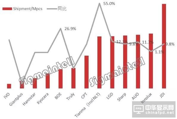 天馬以微弱劣勢位于第六,市場份額約11.3%,但同比增速高達(dá)55%。特別表現(xiàn)搶眼的是其在儀表顯示市場出貨排名擠進(jìn)前二。除繼續(xù)強(qiáng)化小尺寸產(chǎn)品優(yōu)勢外,天馬加大力度開發(fā)車載顯示大尺寸產(chǎn)品,一季度其10英寸以上產(chǎn)品出貨增勢明顯。