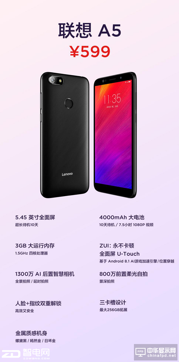 聯(lián)想A5,開啟百元機(jī)長(zhǎng)續(xù)航時(shí)代,售價(jià)599元(3GB+16GB)。