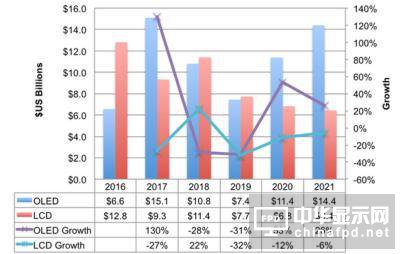 日前,DSCC對顯示設備支出舉行預測,稱2018年OLED支出預計將比2017年下降28%至108億美元(同期LCD支出將增長22%至114億美元)。2018年,中國顯示設備制造商將占據總體顯示相關設備支出的90%。