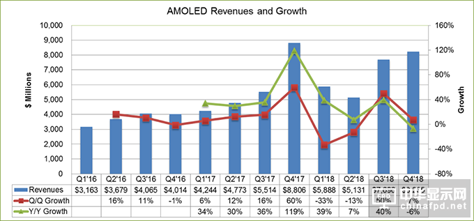 近日,全球顯示領域權威資訊機構Display Supply Chain Consultants(DSCC)宣布了2018年一季度“OLED季度出貨量和Fab利用率報告”。2018年第一季度,行業仍然保持了增長,OLED整體銷售額達59億美元,同比增長39%,預計全年收入達到269.5億美元。