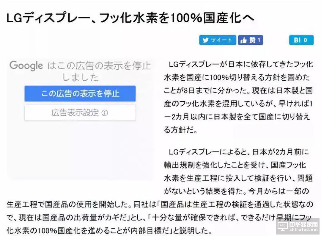 目前LG顯示在產(chǎn)品制程中混用日本產(chǎn)與韓國(guó)產(chǎn)的氟化氫原料,但是最快在1-2個(gè)月內(nèi),將全部以韓國(guó)產(chǎn)品進(jìn)行替代。