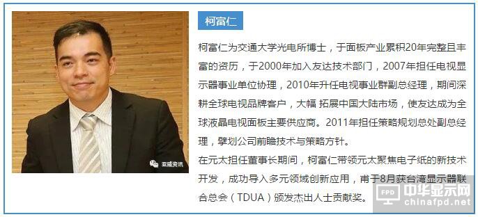 去年友達宣布組織調整,將顯示器產品事業一分為三,分拆成技術研發群、業務事業群與制造營運群。9日又宣布高階人事異動,由曾任友達副總的元太科技董事長柯富仁回鍋擔任總經理暨營運長,原友達總經理蔡國新卸任后則是轉任集團企業達運精密執行長暨總經理一職,人事令自10日起生效。