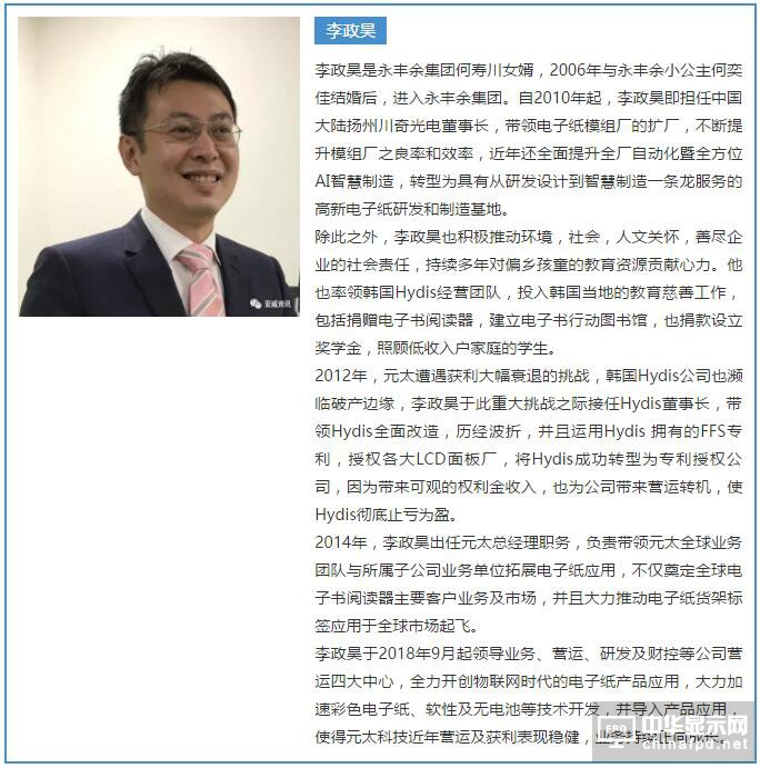 元太方面也出現人事大變動。9月9日,元太董事會宣布,原董事長柯富仁以個人生涯規劃因素,請辭董事長職務,于2019年9月9日董事會決議,由總經理李政昊代理董事長。
