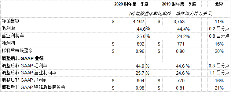 • 2020財年第一季度收入41.6億美元,同比增長11%