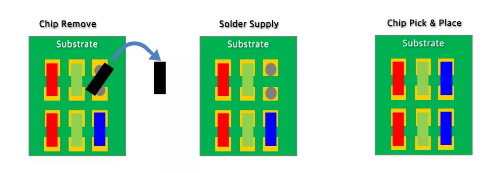 精密Pick & Place來可以移除個別Chip, Chip移除后, 在PAD上點膠小量錫膏