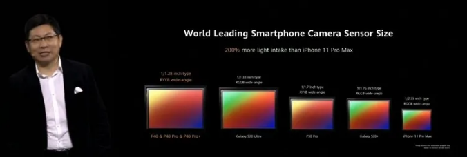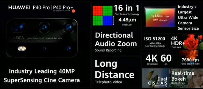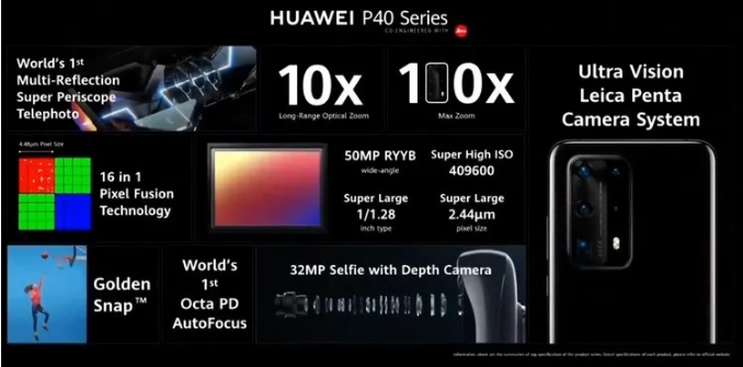 在華為 P40 Pro和華為 P40 Pro+上還加入了4000萬像素超感光電影鏡頭,擁有1/1.54英寸的超大感光尺寸、等效18mm焦距的超廣角視野,以及與全畫幅單反相同的3:2黃金比例畫幅,支持7680fps超高速攝以及HDR視頻拍攝。