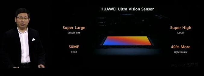 華為P40系列上的5000萬像素主攝,采用1/1.28英寸大底,單像素面積達(dá)1.2μm,四合一等效像素為2.4μm,同時延續(xù)了華為P30系列以及華為Mate30系列上的RYYB陣列,配合超感傳感器和第五代ISP、達(dá)芬奇架構(gòu)NPU、自研感光和處理算法等帶來超高的感光度。