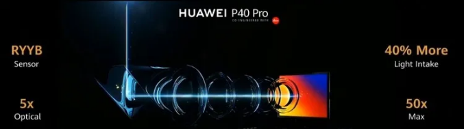 華為 P40 Pro上采用潛望式長焦鏡頭,支持5倍光學(xué)變焦、10倍混合變焦、以及50倍最大變焦。同時首次在長焦上加入RYYB陣列,支持4K延時攝影。