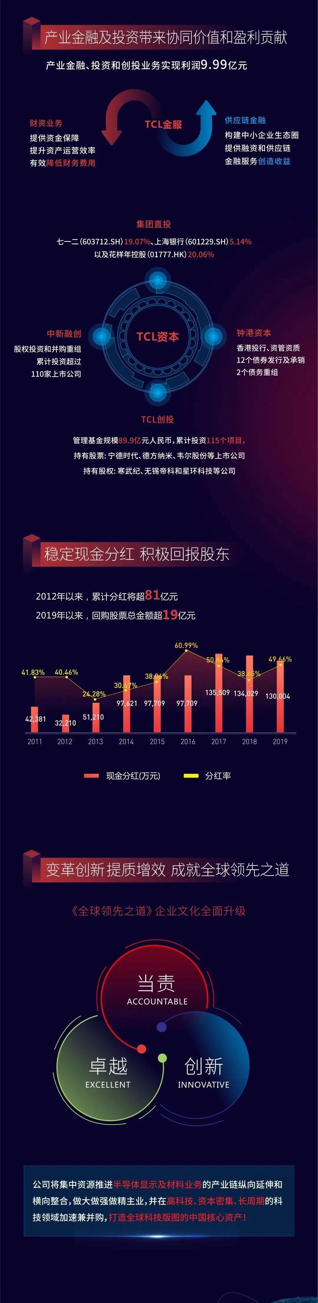 公司將以《全球領先之道》為企業發展綱領,戰略為牽引,以組織和文化為保障,變革突破,提質增效,邁向全球領先的科技產業集團。公司已于 2020 年 2 月 7 日由 TCL 集團股份有限公司更名為 TCL 科技集團股份有限公司,開啟全新發展階段。