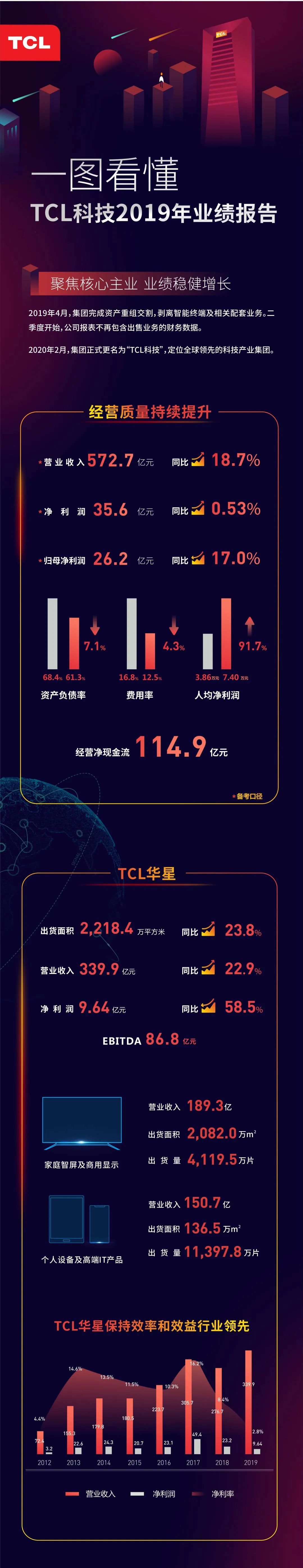 本年度 TCL 科技集團備考口徑完成營業收入 572.7 億元,同比增長 18.7%;凈利潤 35.6億元,同比增長 0.53%;其中歸屬于上市公司股東凈利潤 26.2 億元,同比下降 17.0%。
