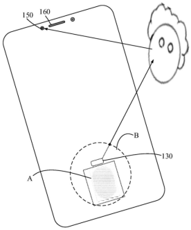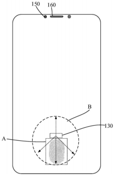 如上圖所示為該專利提供的手機結構示意圖,其中主要包括顯示面板110(如下圖所示)、光學指紋模組120(如下圖所示)、結構光發射組件130,結構光發射組件的發射光在顯示面板上的照射區域覆蓋光學指紋模組的指紋識別區域。
