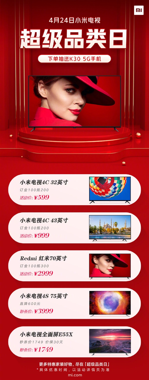 4月24日是小米電視超級品類日,32、43、55、70、75五款不同尺寸電視統統降價優惠,到手價599元起,75英寸電視還不到4000元。