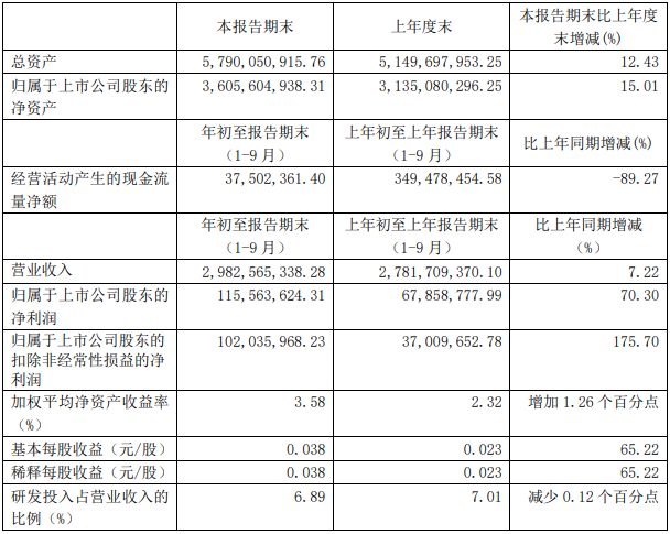 2020年10月26日,昆山龍騰光電股份有限公司發布了三季度財報,公司2020年1-9月實現營業收入29.8億元,同比增長7.2%,歸屬于上市公司股東的凈利潤為11,556萬元,同比增長70.3%,歸屬于上市公司股東的扣除非經常性損益的凈利潤為10,204萬元,同比漲幅175.7%。