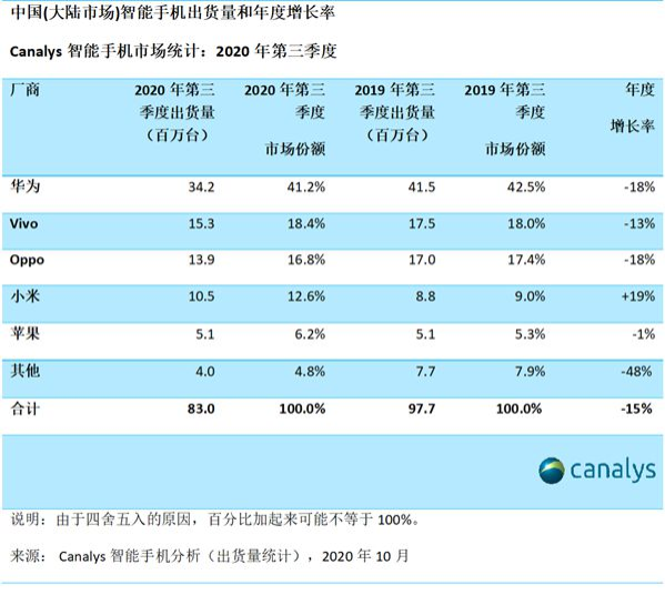 市場調(diào)研機(jī)構(gòu)Canalys近日發(fā)布了2020年第三季度出貨量報(bào)告。報(bào)告顯示,中國智能手機(jī)市場較上季度下滑8%,較去年下降15%,第三季度出貨8300萬臺(tái)。華為依然排名第一,出貨量是排名第五的蘋果的六倍。