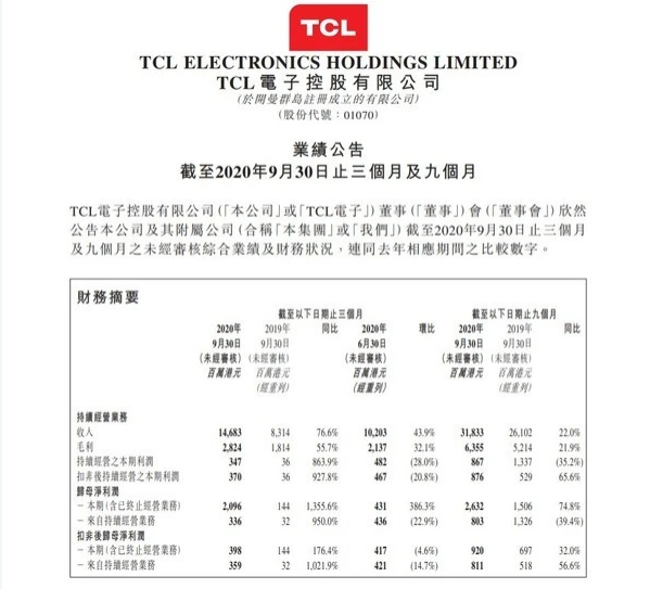 TCL電子日前發(fā)布了2020年第三季度財報,數(shù)據(jù)顯示,TCL電子三季度營收146.83億港元,同比增長76.6%,歸母凈利潤20.96億港元,同比增長1355.6%。TCL品牌電視機第三季度銷售量724萬臺,同比增長49.7%。另外,TCL電子旗下互聯(lián)網(wǎng)公司雷鳥科技第三季度收入同比增長78.7%,其中會員業(yè)務收入同比增長82.3%,增值業(yè)務收入同比增長300%。