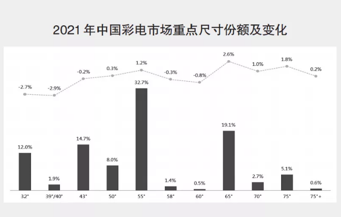 2020 年由于疫情影響物流和安裝,尺寸向一大一小聚攏,32英寸和43英寸產品重新受到消費者青睞,同時65英寸和75英寸大尺寸產品也迎來增長。奧維云網(AVC)分析認為,2021年彩電行業大尺寸化進程繼續,65 英寸和 75英寸產品市場份額保持增長,預計分別增長2.6%和1.8%;2021年中國彩電市場平均尺寸將增加至 53.1英寸,與2020年相比增長1.9英寸,大尺寸化進程的速度加快。