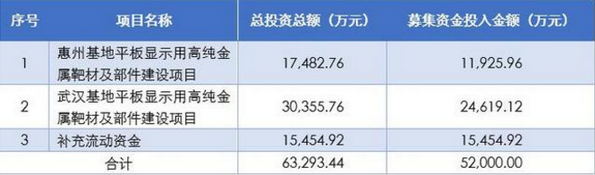 其中,“惠州基地平板顯示用高純金屬靶材及部件建設項目”和“武漢基地平板顯示用高純金屬靶材及部件建設項目”將建設平板顯示制造用的鋁靶、銅靶、鉬靶等全系列高純金屬濺射靶材的生產線、機臺關鍵部件產品生產線,實現為廣東、武漢及周邊地區的平板顯示器制造商規模化供應平板顯示用高純金屬濺射靶材及機臺相關部件。