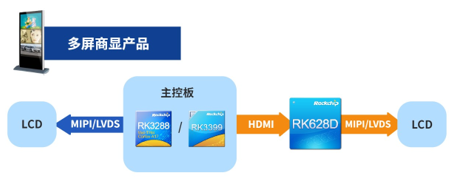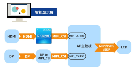 橋接方式:HDMI IN --> MIPI/LVDS OUT,協助主控進行雙屏擴展,可支持雙LVDS/雙MIPI接口