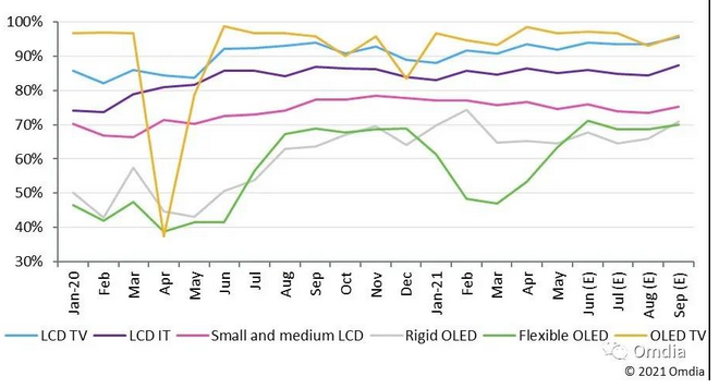 面板制造商計劃在2021年第三季度將工廠利用率維持在90%,同比和環(huán)比均上升1個百分點。在新冠疫情的影響下,直到2021年第二季度,面板制造商已經(jīng)連續(xù)四個季度將其利用率維持在85%以上的高水平。他們計劃在2021年第三季度達(dá)到更高的利用率。