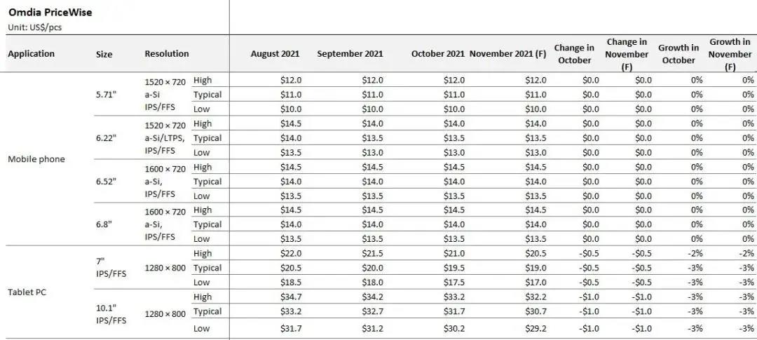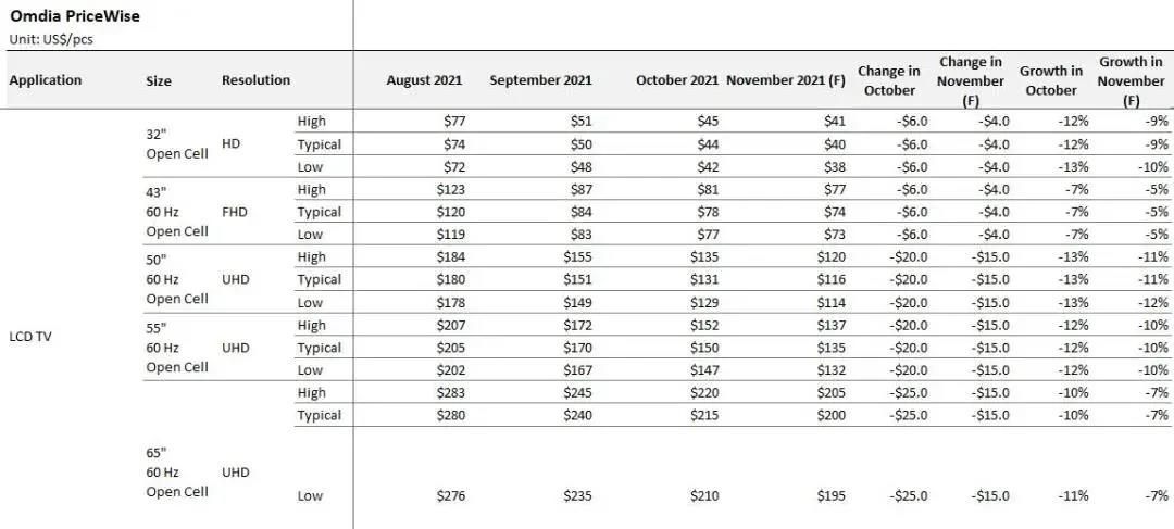 電視面板價格在經歷大漲13個月后,Omdia表示,電視面板今年8、9月價格大幅下滑,震驚整個電視顯示供應鏈,9月價格下跌,是TFT-LCD行業歷史上最大的降幅,各尺寸另月跌14%至32%不等,電視面板10月價格繼續下跌,但是,幅度的下降越來越小,跌幅介于7-13%之間。