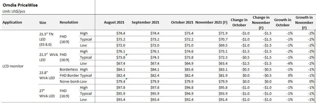 Omdia預測,11月電視面板報價32吋平均跌4美元,跌幅10%;43吋亦跌4美元,跌幅5%;50吋跌15美元,跌幅12%;55吋跌15美元,跌幅10%;65吋跌10美元,跌幅7%,各尺寸平均跌幅均較10月收斂。